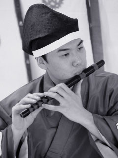 篳篥 小林勝幸 中学校の音楽の授業で初めて雅楽に接す。篳篥を東儀博氏(元宮内庁楽部首席楽長)に、雅楽合奏を芝祐靖氏に、左舞を上明彦氏(元宮内庁楽部首席楽長)、大窪永夫氏(宮内庁楽部楽長補)に師事。「伶楽舎」に所属。 |