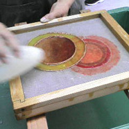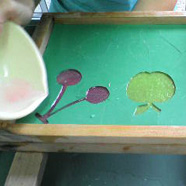 ●この素材を小さいボールですくい、簀(す)の上に流し込む。これを何度も繰り返して、背景を作る。