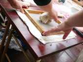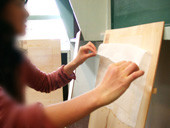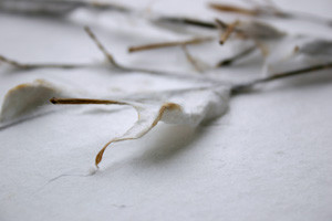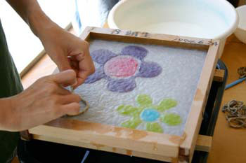 従来の紙漉きは簀を前後にゆすりますが、新しいKAMISUKIは簀を動かしません。素材を簀の中に流し込むのです。この漉き方は、アートや造形作品をつくることを最も得意とします。和紙造形アートスクールでこの新しいKAMISUKIを学ぶことができます。