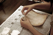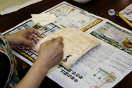 竹のザルに和紙をはって柿渋をぬる。一閑張りで制作しました