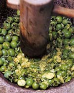 一閑張りはカゴに和紙を貼って柿渋を塗る昔ながらの民芸品。そこにはいつまでも愛用するための先人の知恵がある。柿渋を塗ることで丈夫になり、防水・防腐・防虫の効果がでます。この柿渋は、まだ柿が青いうちに作りますが、甘柿よりも渋柿、本来は豆柿を使います。